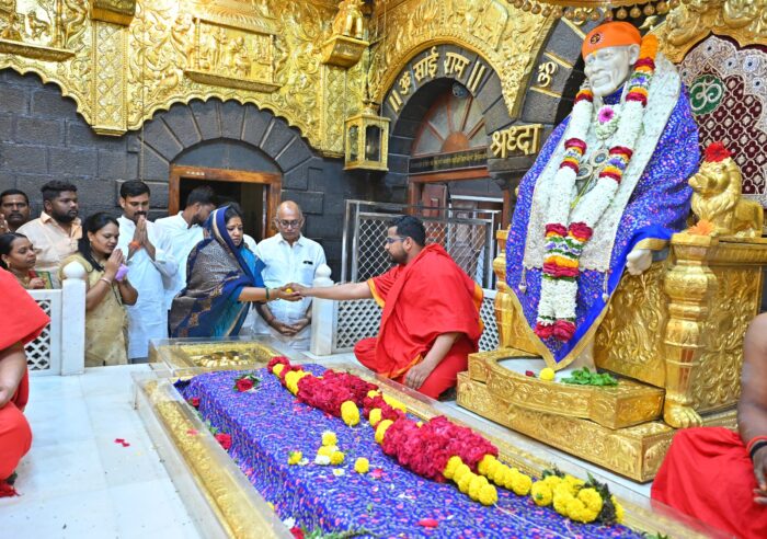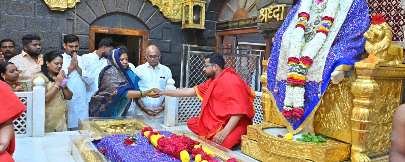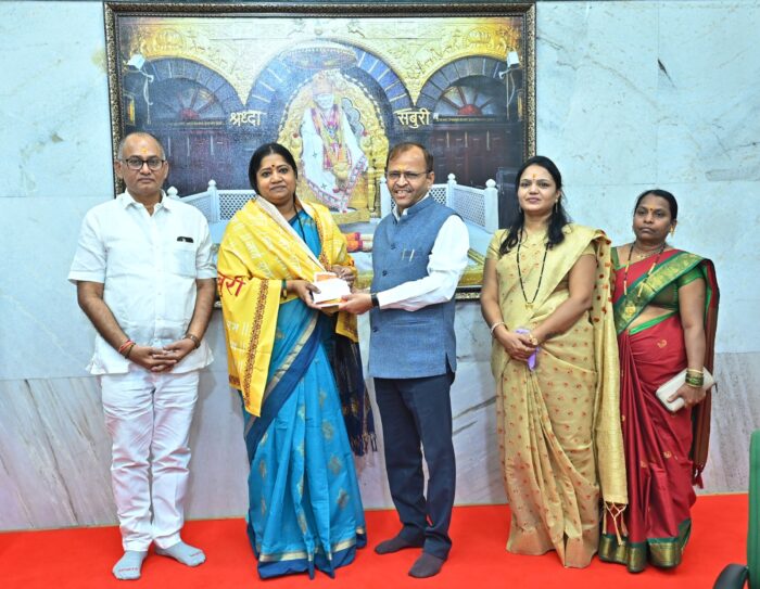 Newly elected Rajya Sabha Member of Parliament, Jyoti Waghmare, visited the holy shrine of Shri Saibaba today to offer her prayers. Following the darshan, she was formally felicitated on behalf of the Shri Saibaba Sansthan Trust. The Chief Executive Officer, Goraksha Gadilkar (IAS), honored her with a traditional welcome and a memento.