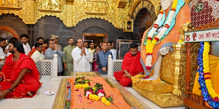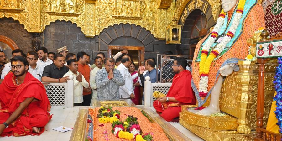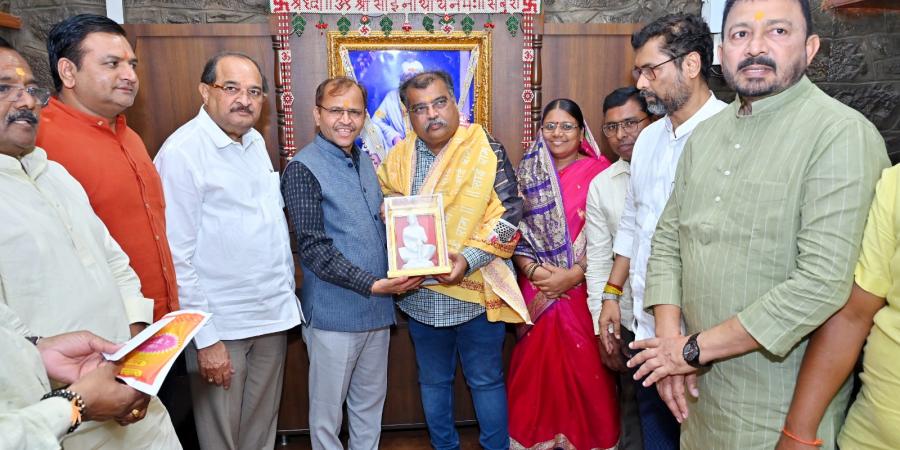 Hon. MLA Ravindra Chavan, BJP State President, Maharashtra, and Hon. Minister Radhakrishna Vikhe-Patil, Water Resources Minister and Guardian Minister of Ahilyanagar, visited and offered prayers at the Samadhi of Shri Saibaba. Following the darshan, they were felicitated by Goraksha Gadilkar (IAS), Chief Executive Officer, on behalf of the Shri Saibaba Sansthan.